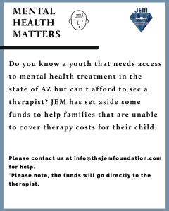 Do you have a child in AZ that needs mental health care and you are unable to afford to pay the counselor or therapist? You are NOT alone and JEM can help. Please contact JEM at info@thejemfoundation.com if you need funds to help cover the cost of your child’s counseling or therapy sessions. Please email your name and phone number so an advocate can reach out to you to discuss the funding needs.